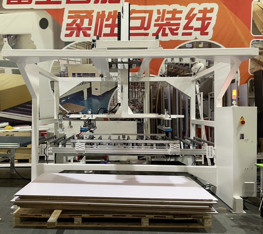 1. Προετοιμασία φόρτωσης: Οι εργαζόμενοι τοποθετούν ολόκληρες παλέτες από ξύλινα πάνελ με βάση το ξύλο στο ράφι τροφοδοσίας του εξοπλισμού. Η πλατφόρμα ανύψωσης του Rack προσαρμόζεται αυτόματα στο αρχικό ύψος αρπαγής.